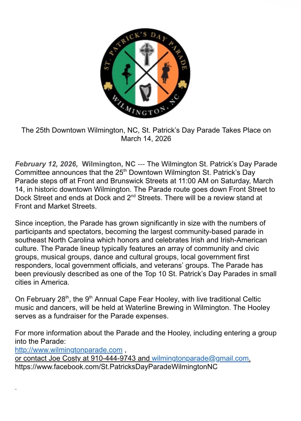 Sláinte! Putting on a parade is a lot of work but raising funds for one has never been more fun. Our Hooley features Irish music and Irish dancing at Waterline Brewery. Saturday, February 28, 2026, 11:30am – 6:00pm.